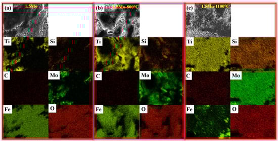 Figure 9 shows the wear track morphology of the Ti–Si–C–1.5Mo coating after being heated at 800 °C and 1100 °C. There are large pits and layer cracks, and a small amount of granular grinding chips in the wear track. In addition, there is a large number of dark-gray areas on the wear track surface. After heat treatment at 800 °C and 1100 °C, the pit sizes became smaller, the layer crack area became less, the granular grinding chip changed little, and the number of dark-gray areas became smaller with the areas becoming larger. Figure 10 shows the distribution of EDS elements on the wear track surface. As seen, Ti/Si/C/Mo elements were found in the wear tracks before and after heat treatment. Fe and O elements were also detected (mainly corresponding to dark-gray areas). From the above research and analysis, it can be seen that the friction pair materials were transferred under the action of friction due to their relatively low microhardness during the friction process, and they adhered to the coating surface, which in turn led to the Fe element being detected on the wear track’s surface. In addition, it is easy to generate an instantaneous high temperature (flash temperature) during the friction process, causing the oxidation of the materials in the wear track, which in turn leads to the O element being detected. Based on an analysis of Figure 9 and Figure 10, it can be determined that the wear mechanisms of the heated Ti–Si–C–1.5Mo composite coating were mixed abrasive wear, adhesive wear and tribo-oxidation wear.