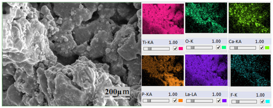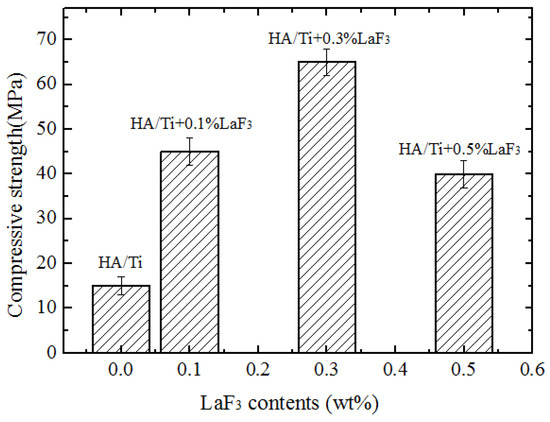 Figure 5 shows the effect of LaF3 addition on the compressive strength of the HA/Ti porous scaffolds. With the increase in rare-earth content, the compressive strength of the porous scaffolds increases first and then decreases. When LaF3 is 0.3%wt, the compressive strength of the porous scaffolds is the largest, reaching 65 MPa. The addition of rare-earth elements can significantly improve the compressive strength of the HA/Ti composites, mainly because the rare-earth element as an effective deoxidizer can absorb the oxygen in the composite, purify the interface of the original particles, reduce the oxygen content of the matrix, and improve the sintering density of the sintered body [19]; the refinement of the structure by LaF3 can also improve the compressive strength of the porous scaffolds. Figure 4 shows that when adding rare-earth LaF3 to 0.3%, the diffraction peak corresponding to CaTiO3 widens significantly, and the diffraction intensity decreases. This indicates that the entropy value of the system is large; that is, the lattice distortion of CaTiO3 is severe, resulting in an increase in the compressive strength of the composite material, which is consistent with the XRD results shown in Figure 4. When adding rare-earth LaF3 to 0.3%, the compressive strength is the highest. On the other hand, research has shown that one of the biggest obstacles in regards to the sintering density of titanium powder is the presence of an oxide film on the surface of the powder particles [26]. The affinity between rare-earth element La and oxygen is much greater than that between Ti and oxygen. Therefore, adding LaF3 to the alloy can effectively activate the titanium powder. Adding a small amount of LaF3 has a significant promoting effect on the sintering densification of the HA/Ti powder metallurgy. The La element carries oxygen on the surface of the Ti powder and diffuses into the matrix to form a Ti (La, O) solid solution, promoting the diffusion of elements between the titanium particles. As the amount of LaF3 added increases, the surface of the activated Ti particles increases, and the densification effect is improved. However, due to the fact that the sintering process mainly occurs in the solid phase, excessive secondary particles will hinder the plastic and viscous flow of the sintering process, thereby reducing the sintering density. Therefore, when the amount of LaF3 added is 0.5%, the relative density of the material decreases, and its compressive strength also decreases [18].