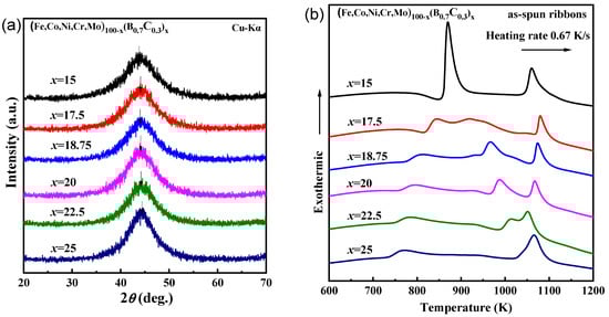 (a) X-ray diffraction (XRD) patterns and (b) differential scanning calorimetry (DSC) curves of the as-spun (Fe0.25Co0.25Ni0.25Cr0.125Mo0.125)100−x(B0.7C0.3)x (x = 15, 17.5, 18.5, 20, 22.5, 25 at.%) ribbons.