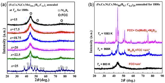 (a) XRD patterns of the (Fe0.25Co0.25Ni0.25Cr0.125Mo0.125)100−x(B0.7C0.3)x (x = 15, 17.5, 18.5, 20, 22.5, 25 at.%) alloys annealed for 1800 s at each first exothermic peak temperature (Tp1) of these as-spun glassy alloys. (b) XRD patterns of as-spun (Fe0.25Co0.25Ni0.25Cr0.125Mo0.125)80(B0.7C0.3)20 alloy annealed for 1800 s at 803 K, 966 K and 1093 K, corresponding to the three exothermic peak temperatures.