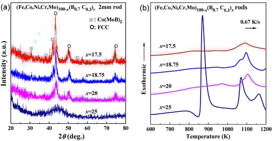 (a) XRD patterns and (b) DSC curves of the as-quenched (Fe0.25Co0.25Ni0.25Cr0.125Mo0.125)100−x(B0.7C0.3)x (x = 17.5, 18.5, 20 and 25 at.%) rods with a diameter of 2 mm.