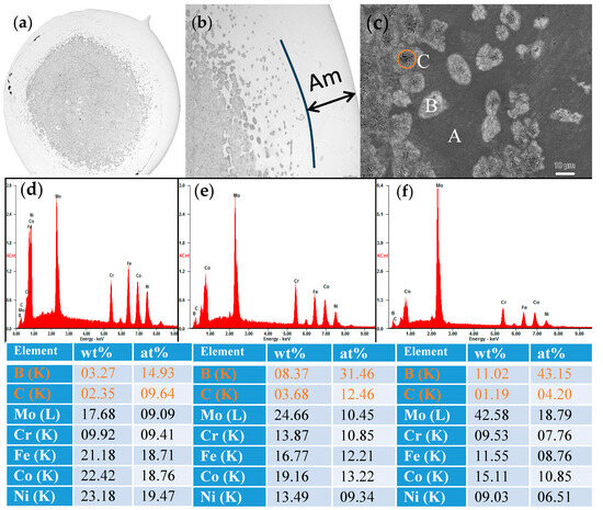 To illustrate the microstructure of the (Fe0.25Co0.25Ni0.25Cr0.125Mo0.125)80(B0.7C0.3)20 alloy rod, the SEM images are presented in Figure 4a–c. As can be seen from Figure 4a,b, the region near the outer periphery of the cylinder is amorphous. As it moves towards the center position of the cylinder, there is a gradual transition from the amorphous phase to a region where amorphous and crystalline phases coexist, and finally to a region comprising entirely crystalline structures. As shown in Figure 4c, in addition to the amorphous phase labeled as region A, there are two types of crystal phases, labeled as region B and C. In order to elucidate the composition of regions A, B, and C, Energy Dispersive X-ray (EDX) spectroscopy profiles are presented in Figure 4d–f, respectively. The composition of region A is close to the original alloy composition, although the carbon content is higher, indicating it can be identified as the remaining amorphous phase after crystal precipitation. In region B, there is an increase in boron, chromium, and molybdenum contents, while in region C, the boron content further elevates, suggesting the presence of Co(Mo, B)2 phase. This component redistribution behavior is in accordance with the results obtained from XRD analysis in Figure 3.