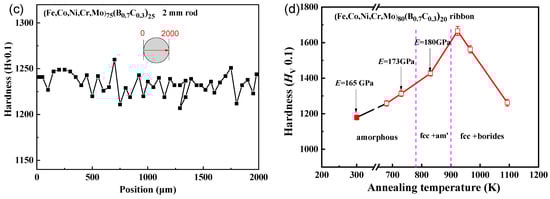 Vickers hardness of (a) (Fe0.25Co0.25Ni0.25Cr0.125Mo0.125)82.5(B0.7C0.3)17.5, (b) (Fe0.25Co0.25Ni0.25Cr0.125Mo0.125)80(B0.7C0.3)20, (c) (Fe0.25Co0.25Ni0.25Cr0.125Mo0.125)75(B0.7C0.3)25 along the central axis of the cross-section rod sample with a diameter of 2 mm, and (d) the Vickers hardness (Fe0.25Co0.25Ni0.25Cr0.125Mo0.125)80(B0.7C0.3)20 for the ribbon samples annealed from 680 K to 1093 K and the structure and Young’s modulus are also shown.