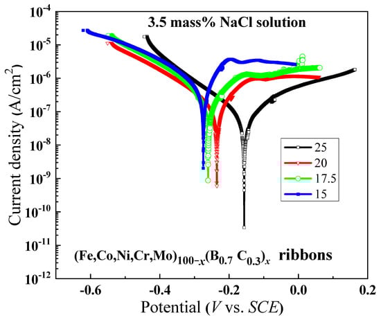 Polarization curves of (Fe0.25Co0.25Ni0.25Cr0.125Mo0.125)100−x(B0.7C0.3)x (x = 15, 17.5, 20 and 25) amorphous ribbons in 3.5 mass% NaCl aqueous solution at 298 K.