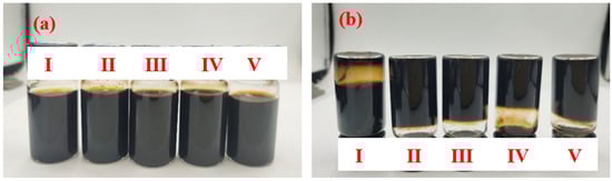 The dispersion of the Lap-GO solution with the different mass ratios of Laponite/GO dispersion immediately after ultrasound and one month after ultrasound are shown in Figure 4a,b. The mass ratios of Laponite/GO in Sample I, Ⅱ, Ⅲ, Ⅳ, and Ⅴ are 10:1, 10:2, 10:4, 10:6, and 10:8, respectively. It is confirmed that with the increase in the specific gravity of GO, the Lap-GO dispersion solution does not easily fall, and its gel is gradually settled.