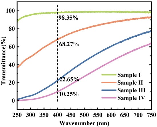 The transmission test results of the three types of Lap-GO dispersions and the Laponite colloidal dispersion are shown in Figure 5. The mass ratios of Laponite/GO in Sample I, Ⅱ, Ⅲ, and Ⅳ are 10:0, 10:1, 10:5, and 10:10, respectively. The Laponite dispersion showed almost 100% transmission ratio, and with the addition of GO, the transmittance of Lap-GO dispersion aqueous solution in the visible light range immediately decreased. At a wavelength of 400 nm, the transmittance of Sample II decreased to 68.27%, Sample III decreased to 22.65%, and Sample IV decreased to 10.25%.