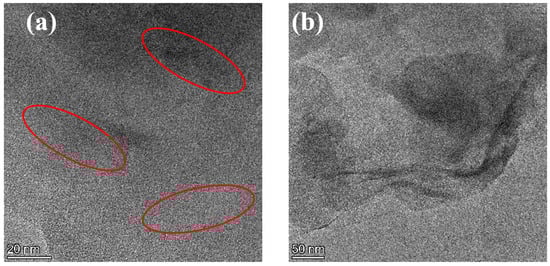 The nanoscopic dispersion of Lap-GO in polyurethane is shown in Figure 7. The dark lines (inside the red circle) represent Lap-GO, while the bright area represents the WPU matrix. For the Lap-GO/polyurethane coatings, the dispersed Lap-GO liner and stacking of multiple layers of material are likely due to Lap-GO dispersed in a layered manner in the polyurethane matrix. In summary, Lap-GO is uniformly dispersed in a few layers in the polyurethane matrix after ultrasonic dispersion.