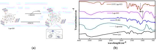 Due to the π–π force between graphene sheets, they are prone to re-stacking and agglomeration [], while the oxygen-containing functional groups between oxidized graphene sheets make them easy to modify. J Ming et al. [] used p-Methyl styrene groups covalently grafted onto graphene oxide (GO) via esterification reactions. T Furkan et al. [] used two different monomers, namely hexafluoro butyl acrylate (HFBA) and diethyl aminoethyl methacrylate (DEAEMA), individually to modify graphene oxide (GO) nanosheets via the environmentally friendly plasma-enhanced chemical vapor deposition (PECVD) method. Laponite (with molecular formula Na+0.7 [(Si8Mg5.5Li0.3) O20(OH)4]0.7−) is a synthetic hectorite clay with disc-shaped particles that are similar in size to the hard segments of polyurethane (mean diameter of 30 nm and thickness 1 nm) []. Meanwhile, studies have shown that a series of nano clay materials such as Laponite are widely used to assist the dispersion of graphene and GO in the matrix []. GO and Laponite have excellent water dispersion, and the composite of GO and Laponite with waterborne polyurethane coatings is conducive to uniform dispersion of nanomaterials.