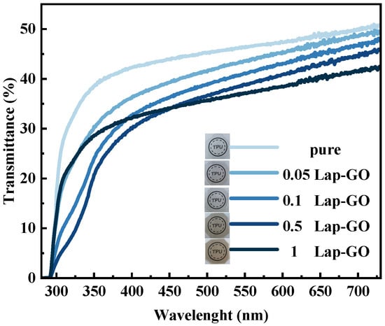 Macroscopic observation and ultraviolet transmittance were conducted on the Lap-GO/polyurethane composite coating with uniform thickness, and the optical photos and data are shown in Figure 12. The visual observation of the coating indicates that the coating quality is high in all cases and there are no surface defects such as bubbles, yellowing, or cracks. For 0.05Lap-GO and 0.1Lap-GO, the optical photos of composite coatings are similar to those of pure polyurethane coatings. For 0.5Lap-GO and 1Lap-GO, the optical photos of composite coatings showed significant color changes.
