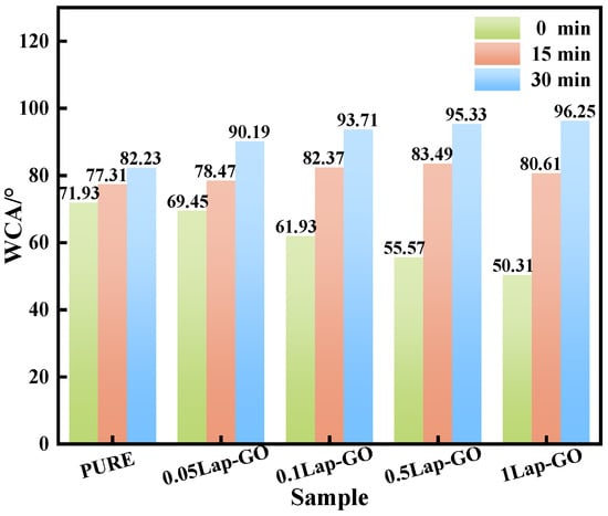 The WCA test results of the Lap-GO/polyurethane composite coating and the coating after UV reduction for different durations (0 min, 15 min, 30 min) are shown in Figure 13. It was found that between the 0.05Lap-GO composite coating and the 1Lap-GO composite coating, the WCA of the composite coating decreased from 71.93° to 50.31° with the increase in Lap-GO content, which was mainly attributed to the oxygen-containing functional groups such as the hydroxyl and carboxyl groups in the added GO, as well as the electrostatic differences between the surface and edge of Laponite. The presence of these hydrophilic groups and Na+ improves the hydrophilicity of the composite coating. UV reduction decreased the oxygen-containing functional groups on the GO surface, and the composite coating gradually changed to hydrophobicity, gradually increasing its WCA.