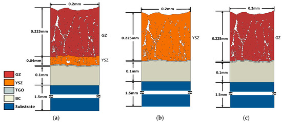 To study the thermal stress levels and their distribution in a single-layer SPS TBC system, the same geometrical model of the double-layer TBC was used. However, only the outermost ceramic layer (GZ layer in the double-layer model) was considered while excluding the geometrical representation of the YSZ layer to form a single-layer FE model, see Figure 3b,c. To study stress concentration and distribution in single-layer and double-layer structures while mitigating the effect of changing microstructure morphology, the geometrical features remained the same. Two FE models for the single-layer SPS TBC were considered by modeling the behavior of the TC ceramic layer using the thermomechanical properties of YSZ and GZ materials, Figure 3b,c. In the single-layer model, the lower surface of the ceramic layer was offset by 2, 5, and 8 μm to form the TGO layer. Therefore, the uneven and dynamic growth of the TGO layer was not modeled.