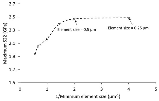 The complexity of the geometrical features (e.g., pores, intercolumnar gaps, and interfaces) of the TBC structure requires a reduction in the element size to achieve stability and accuracy of the results. However, it is well known that reducing the element size leads to a significant increase in the run time. Therefore, to attain the accuracy of results and reduce the computational cost, mesh sensitivity analysis was carried out. To do this, the FE model was run using six different mesh sizes, as introduced in Table 3. The maximum stress in the Y-direction (S22) was chosen to assess mesh convergence. It was plotted against the reciprocal of the element size for visualization, see Figure 5. Reducing the minimum element size beyond 0.5 μm had no considerable effect on the analysis results (Figure 5). Hence, a minimum element size of 0.5 μm was used in the meshing procedure with a total number of 295,322 quadrilateral elements generated for the double-layer SPS TBC model. The eight-node plane strain thermally coupled biquadratic displacement bilinear temperature reduced integration element (CPE8RT) was used in this analysis. Quadratic shape functions enable a higher interpolation order of the displacement fields to attain a more precise distribution of the predicted stress.