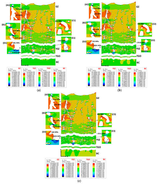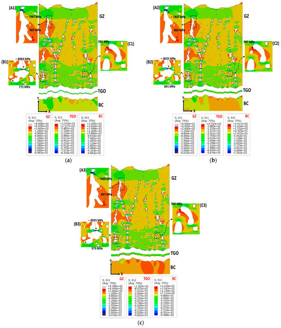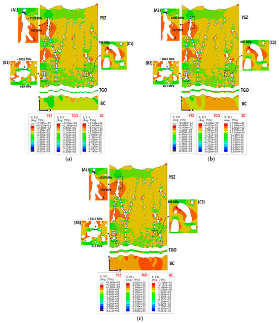 In this section, the thermal stresses developed within a single-layer YSZ-TBC system are explored. Vertical cracks in TBCs are caused by normal stresses in the X-direction (S11). Figure 11a–c shows the S11 stress distribution for single-layer TBC components (YSZ, TGO, and BC layers) at TGO thicknesses of 2, 5, and 8 µm. Different locations in the YSZ ceramic layer along its thickness were identified using auxiliary magnified frames A, B, and C to enhance the visibility of stress concentration near pores and intercolumnar gaps. Again, the pores and intercolumnar gaps can create stress concentration sites due to their complex geometry and interaction zones, which are clearly visible in the magnified frames, Figure 11a–c. On the other hand, areas away from the interaction zones between the intercolumnar gaps and pores exhibit comparatively lower stress values. The increase in the TGO thickness has the effect of changing both the magnitude and the distribution of the S11 stress component within the YSZ ceramic layer. For instance, the magnitude of the tensile S11 stress at the upper region of the YSZ layer was reduced from 783 MPa to 750 MPa as the TGO thickness increased from 2 to 8 µm, respectively, see Figure 11a–c (magnified frame (A1–3). Similarly, the compressive stress exhibited a reduction of approximately −300 MPa. Simultaneously, the S11 stress distribution revealed a tendency to evolve and localize in the vicinity of pores that are relatively closer to the YSZ/TGO interface, corresponding to the increase in TGO thickness. At 2 µm TGO, the tensile S11 stress was found to localize (798 MPa) at the corner of the pore, as shown in the magnified frame C1, Figure 11a. The increase in TGO thickness to 5 and 8 µm resulted in both an increase and a shift in stress concentration toward the vicinity of a pore that is relatively closer to the YSZ/TGO interface, see Figure 11b,c (magnified frame (B2,3)). The tensile S11 stress at this highlighted porosity (shown in frames B1–3) increases from 699 MPa at 2 µm TGO to 915 MPa at 8 µm TGO. Hence, the swelling of TGO at elevated temperatures has the effect of reducing stress levels at the upper regions of the TC, while increasing stress localization at the lower portion of the ceramic TC layer. This can lead to the initiation of cracks at different locations within the TBC system. Furthermore, the S11 stress level in the single-layer YSZ model is relatively lower than that in the double-layer model, that is, increasing the number of ceramic layers can increase the thermal stresses [62]. The TGO layer exhibited mostly compressive stresses ranging between approximately 900 MPa and −10,000 MPa at different TGO thicknesses, see Figure 11a–c. The increase in the TGO thickness resulted in an increase in the compressive stress concentrations, as evident from the stress contour. Again, this can be attributed to the low thermal expansion of the TGO layer as compared with the other TBC layers, especially the metallic bond coat and substrate materials [53]. The compressive stresses apart from the stress concentration areas approximately ranging from −2000 MPa to −6000 MPa, which can be aligned with the experimental measurements that show thermal stresses in the TGO layer, can reach around −8000 MPa [53,54]. Moreover, it was observed that the compressive stress developed across the TGO layer in the single-layer model is comparatively lower than that generated in the double-layer model, see Figure 6a–c and Figure 11a–c. The bond coat (BC) layer exhibits thermal stresses (S11) within the range of approximately 320 MPa to −950 MPa. The increase in the TGO thickness can result in some stress localization along the BC interface, owing to its irregularity, and affect the stress distribution, as evident from the S11 contour shown in Figure 11a–c.