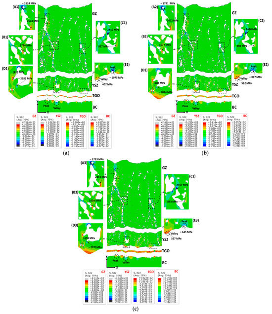 Normal stresses in the Y-direction (S22) that are perinuclear to the general configuration of TBC interfaces are the prime driving force for horizontal crack initiation and propagation within the ceramic layer of the TBC system, leading to coating spallation and delamination [40,42]. The S22 stress distribution within the double-layer TBC layers (i.e., GZ, YSZ, TGO, and BC) at different TGO thicknesses (2, 5, and 8 μm) is presented in Figure 7a–c. Frames A, B, C, D, and E distinguish critical regions of high-stress concentration that may cause crack initiation, see Figure 7a–c. It is obvious from Figure 7a–c that, the S22 stress distribution was considerably impacted by intercolumnar gaps and pores within the ceramic layers (GZ, YSZ), resulting in S22 being localized around the corners of the pores and intercolumnar gaps. The increase in the TGO layer thickness has the effect of reducing the magnitude of S22 stress in the GZ layer, as illustrated in the magnified frames in Figure 7a–c (A1–3, B1–3, C1–3). Figure 7a–c (frame A1–3) shows that the maximum stress S22 in the GZ layer dropped from 2524 MPa to 2415 MPa as the TGO thickness increased from 2 to 8 μm, respectively. Generally, the YSZ layer has a lower stress level, around 800 MPa, compared with the GZ layer, see Figure 7a–c. Hence, there is a higher potential for the development of horizontal cracks within the GZ layer compared with the YSZ layer, which is consistent with our previous experimental observations [16]. Based on the FE results, it was observed that increasing the thickness of the TGO layer caused a shift in stress localization toward the corners of pores near the YSZ/TGO interface and altered the S22 stress level within the YSZ layer. For instance, the maximum stress of 1623 MPa was detected at 2 μm TGO to localize at the vicinity of a relatively large pore located in nearly the middle of the YSZ layer, see Figure 7a (frame D1). Thickening of the TGO layer results in shifting the stress localization to pores close to the YSZ/TGO interface in addition to relatively increasing the S22 stress value to be 1703 MPa and 1659 MPa at 5 and 8 μm TGO, respectively (Figure 7b,c (frame D2,3)). A similar trend, that is localization and shifting of the stresses in the vicinity of pores near the interface between the TC layer and TGO layer has been reported in the published literature [18,19,40].