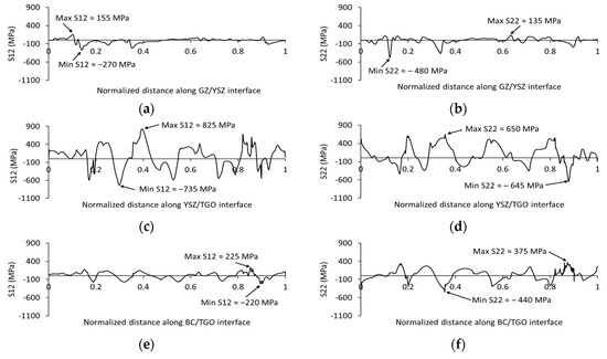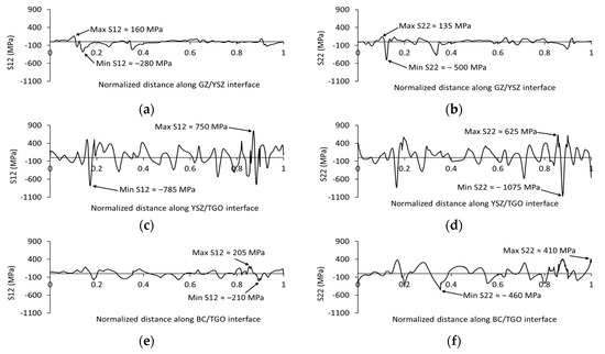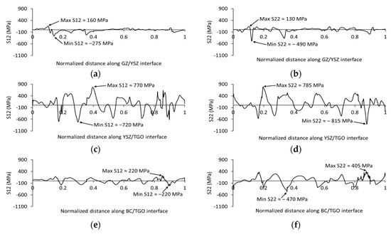 This section presents the predicted FE stress distributions for the S12 and S22 stresses at different TGO thicknesses along the interfaces in a double-layer SPS coating, namely, the GZ/YSZ, YSZ/TGO, and TGO/BC interfaces. As highlighted before, shear stress (S12) causes mode II fractures (i.e., shear failure) along the interface, while normal stress (S22) causes mode I fractures (i.e., separation failure) [19,20,29]. The stress variation in S12 and S22 along the GZ/YSZ interface at the 2 μm TGO thickness is shown in Figure 8a,b. The distribution of shear stress (S12) and normal stress (S22) depends distinctly on the interface roughness [20]. It is evident that some critical regions along the GZ/YSZ interface result in both shear and normal stress concentration, recognized as sharp peaks (tensile stress) and deep valleys (compressive stress), see Figure 8a,b. While apart from these regions, the stress levels are comparatively lower. The GZ/YSZ interface experiences relatively low shear (S12) and normal (S22) stresses ranging between 160 MPa and −280 MPa and 135 MPa and −500 MPa. It is worth mentioning that normal compressive stresses can help prevent interface crack initiation and propagation [18,20,60]. Increasing the TGO thickness was found to have a negligible effect on both the magnitude and distribution of the shear (S12) and normal (S22) stresses along the GZ/YSZ interface, which is evident from the constancy in the value and location of the maximum and minimum stress concentrations, see Figure 9a,b and Figure 10a,b. The shear stress ranged from approximately 160 MPa to −275 MPa as the TGO thickness increased to 5 and 8 μm, while the normal stress ranged from nearly 135 MPa to −490 MPa. The stress levels developed across the interface between the ceramic layers (i.e., GZ and YSZ) at different TGO thicknesses are considered low as compared with the stress values developed along the YSZ/TGO and BC/TGO interfaces, especially the YSZ/TGO interface. This can be attributed to the close values of the thermal expansion coefficient between the GZ and YSZ layers, which leads to potentially lower stresses. Furthermore, this can be correlated to the experimental studies [12,13,16], where cracks were recorded inside the ceramic layer or at the TGO interface in multilayer SPS coatings after isothermal and cyclic thermal loading procedures.