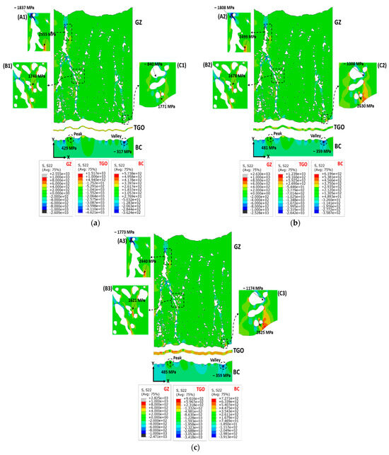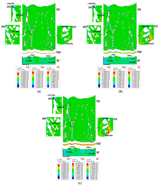 The distribution of normal stresses in the Y-direction (S22) within the YSZ single-layer TBC layers (i.e., YSZ, TGO, and BC) at various TGO thicknesses (2, 5, and 8 μm) is illustrated in Figure 12a–c. The concentration of the S22 component around pores and intercolumnar gaps is significantly higher than the normal stress in the X-direction. This promotes the development of horizontal cracks rather than vertical ones [12,16,17]. The increase in TGO thickness was observed to impact the distribution of the S22 stress within the YSZ layer in such a way that stress localizes in the proximity of pores near the YSZ/TGO interface as the TGO thickness increases, similar to the S11 stress fields. At 2 μm TGO, the S22 stress is localized (2275 MPa) at the proximity of the intercolumnar gap located at the upper side of the YSZ layer, see Figure 12a (frame A1). Increasing the TGO thickness to 5 and 8 μm results in a significant increase in the magnitude of the S22 stress, reaching 2684 MPa and 2895 MPa, respectively, and additionally shifts the location of the stress concentration to the corners of pores adjacent to the YSZ/TGO interface, see Figure 12b,c (frame C2,3). As mentioned earlier, the S22 stress developed along the YSZ/TGO interface exhibited a tensile nature in the valley regions and compressive values at the peaks. On the contrary, this behavior was reversed in the BC layer, where the peak regions exhibited tensile S22 stresses, and the valleys experienced compressive stresses, Figure 12a–c. The increase in TGO thickness led to an increase in the localization of tensile and compressive stresses along the BC interface, generally varying between approximately 560 MPa and 720 MPa and from −350 MPa to −400 MPa, respectively. These highlighted findings match well with the reported numerical and experimental investigations [12,16,18,20]. The distribution of S22 stress within the TGO layer at different thickness values (2, 5, and 8 μm) ranges between approximately 1400 MPa and −4500 MPa, as shown in Figure 12a–c.