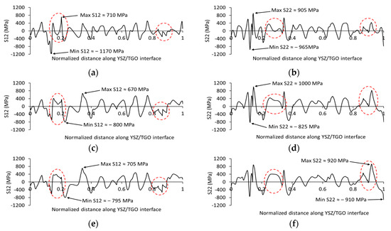 The single-layer TBC system includes two interfaces, namely, the TC/TGO and BC/TGO interfaces, at which cracks can potentially develop due to the thermal shear and normal stresses generated along these interfaces under thermal loading [58,61]. Based on the conducted finite element simulation for the YSZ single-layer TBC, it was observed that the shear (S12) and normal (S22) stresses developed along the YSZ/TGO interface were higher than those generated along the BC/TGO interface. At the YSZ/TGO interface, the shear (S12) stress varied between 710 MPa and −1170 MPa, and the normal (S22) stress changed between 1000 MPa and −825 MPa, whereas the BC/TGO interface exhibited shear stress ranging between 230 MPa and −170 MPa, and the normal stress varied between nearly 700 MPa and −350 MPa. These trends in thermal stress concentration along the TC/TGO interface, as compared with those developed at the BC/TGO interface, match the findings reported by Zhu et al. [20]. Hence, this section reports and discusses the shear and normal stresses for the YSZ/TGO interface developed at different TGO thicknesses. The shear stress (S12) distribution along the YSZ/TGO interface at different thicknesses of the TGO layer (2, 5, and 8 μm) is shown in Figure 13a,c,e. It is evident that the increase in TGO thickness primarily affects the distribution of S12 stress along the interface rather than causing high-stress localization in specific regions. The highlighted regions along the YSZ/TGO interface (refer to Figure 13a,c,e) illustrate the redistribution of shear stresses as a result of the increase in TGO thickness. Figure 13b,d,f shows the distribution of the S22 stress component along the YSZ/TGO interface at TGO thicknesses of 2, 5, and 8 μm. Furthermore, it can also be observed that the location of maximum and minimum stress localization can change according to the thickness of the TGO layer. Again, the influence of the increase in TGO thickness redistributes the stress concentration across certain regions at the interface, as highlighted in Figure 13b,d,f. At different TGO thicknesses, the levels of normal tensile stress are approximately 200 MPa higher than the corresponding shear stress values, indicating a higher potential for separation mode failure (mode I).