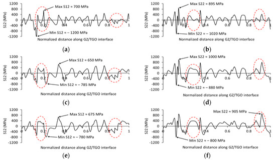 Interfacial delamination can take place either along the TC/TGO interface or the BC/TGO interface in a traditional TBC system (single-layer) due to the shear (S12) and normal (S22) stresses developed during thermal loading. It was observed that the shear (S12) and normal (S22) stresses developed along the GZ/TGO interface are greater than those generated along the BC/TGO interface. The shear (S12) stress developed at the GZ/TGO interface was found to vary between 700 MPa and −1200 MPa, and the normal (S22) stress ranged from 1000 MPa to −1020 MPa, whereas the BC/TGO interface exhibited shear stress within the range of 230 MPa to −175 MPa, and normal stress varied from approximately 725 MPa to −390 MPa. Therefore, this section presents and analyzes the shear and normal stress distributions at the GZ/TGO interface under varying TGO thicknesses. The distribution of shear stress (S12) along the GZ/TGO interface at varying TGO layer thicknesses (2, 5, and 8 μm) is shown in Figure 16a,c,e. Notably, the increase in TGO thickness alters the distribution of S12 stress along the interface rather than inducing high-stress localization in specific regions (see the max and min values in Figure 16a,c,e). Highlighted areas along the GZ/TGO interface (as shown in Figure 16a,c,e) illustrate the redistribution of shear stresses resulting from the increased TGO thickness. The distribution of the S22 stress component along the GZ/TGO interface at the 2, 5, and 8 μm TGO thicknesses is presented in Figure 16b,d,f. Once again, the increase in TGO thickness influences the redistribution of the stress profile across specific areas at the interface, as highlighted in Figure 16b,d,f. At varying TGO thicknesses, the normal tensile stress levels are around 200 MPa higher than the corresponding shear stress values, suggesting an increased potential for mode I failure.