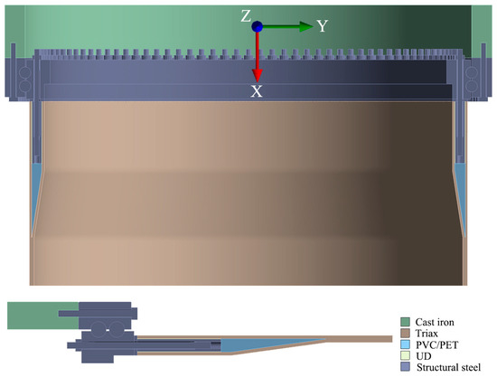 Model development and mesh division are integral aspects of finite element modelling. The size of the model and the number of meshes directly affect the calculation scale and accuracy. In order to ensure a quick and convenient follow-up finite element analysis, only a part of the blade root was modelled. Due to symmetry, for the case of 112 bolts, the calculations used 1/224 of the entire model. This means on one edge, the bolt was sliced in order to have a half bolt in the model. On the other side, the model was sliced just in between two bolts. Figure 2 shows a schematic of the ½ and 1/224 finite element models used to establish the bushing-insert connection. Based on the parameters in Table 1, the solid model of each component of the blade root was established by the CATIA software (CATIA V5; the CATIA is a CAD/CAE/CAM-integrated software of the French company Dassault System, which supports all industrial design processes from pre-project stage, specific design, analysis, simulation and assembly to maintenance.). A mesh size of approximately 4 mm was defined and all the solid meshes were assigned SOLID185 unit properties. The solid elements were solved using the Static Structural analysis module in the finite element software ANSYS workbench (ANSYS 2021 R2; the ANSYS finite element software is a versatile finite element method computer design program that can be used to solve problems such as structures, fluids, electricity, electromagnetic fields, and collisions). Three different 1/224 finite element models were constructed with 155,456; 165,048; and 172,142 numbers of nodes and 122,593; 129,779; and 135,113 numbers of meshes. The coordinate system is also depicted in Figure 2.