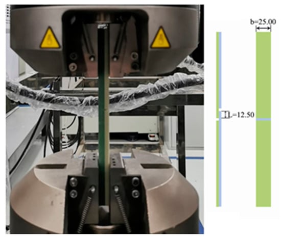 The test was conducted using an INSTRON 5982 test machine and a strain gauge displacement sensor purchased from Instron (Shanghai) Testing Equipment Trading Co., Ltd. (Shanghai, China) Test Equipment Trading Co., Ltd. The grip pressure and test speed were set to 20 bar and 1 mm/min, respectively. Figure 3 shows the test machine and sample sizes.