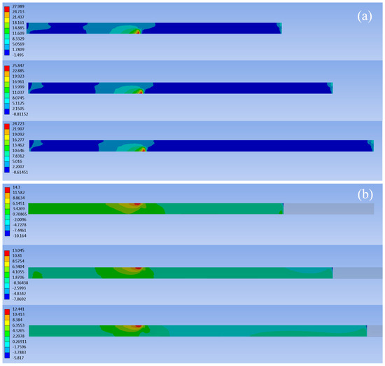 A commonly observed failure mode of a blade root is the separation of the FRP wedge-sticks from the blade root. The finite element method was used to analyse the influence of the slope of the inclined surface of the FRP wedge-sticks on the contact surfaces between the FRP wedge-sticks and the blade root. The stress exerted on the contact surfaces between the FRP wedge-sticks and blade roots was examined during the operation. Subsequently, the critical stress was determined for reinforcing and enhancing the reliability of the blade root connection. The FRP wedge-stick and blade root share three contact surfaces (long, short, and inclined). The shear-stress cloud diagrams for the long and short contact surfaces are shown in Figure 6 and Figure 7, respectively. On the long surface, the shear stress decreased as the slope decreased, with the maximum stress appearing at the end of the bushing. Additionally, the shear stress increased as the thickness of the FRP wedge-stick decreased.