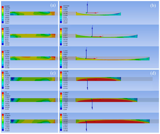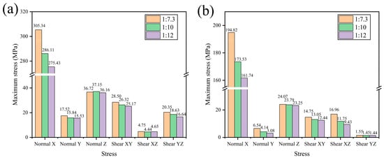 The maximum normal stresses on the various FRP wedge-sticks and blade roots in the X, Y, and Z directions and the maximum shear stresses in the XY, XZ, and YZ planes were compared and analysed, as shown in Figure 8.