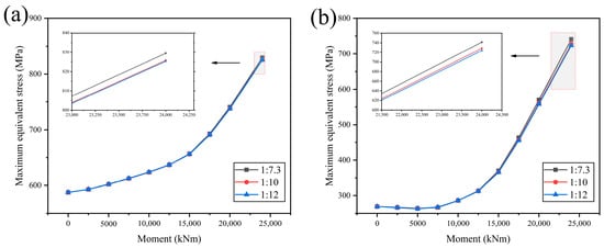 Maximum equivalent stress on the (a) bolt and (b) bushing under different bending moments.