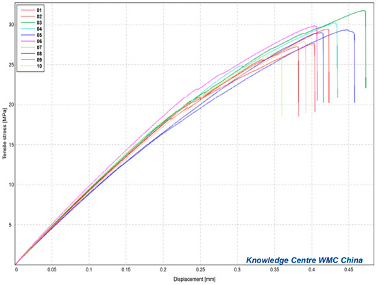 Table 4 and Figure 10 present the test results for the 10 samples. The maximum, minimum, and average stresses were 31.76, 26.74, and 28.92 MPa, respectively.