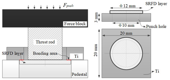 The experiment was conducted using a 1064 nm Dapeng laser marking machine (FB-60-GS, Guangzhou, China) tuned to a power output of 60 W, a spot size of 50 μm, and a pulse width of 30 ns. A mixed acid of HF (12 g/L) and HNO3 (175 g/L) was used to remove potential oxides after the surface texturing process. A cross-section of the deposited layer was characterized with an optical microscope (OM, Keyence VHX-7000, Japan). The corroded morphologies of the deposited layer were characterized using a scanning electron microscope (SEM, ZEISS Supra 55, Germany) equipped with an energy dispersive spectrometer (EDS). The grain sizes were measured by electron backscatter diffraction (EBSD) with a step size of 0.5 μm. The specimen for EBSD was polished by a cross-section polisher for 5 h. HKL Channel 5 software was used to analyze the raw EBSD data. A Peel strength test was conducted on an tension tester (AGSX500N-type, Japan) with a punch peeling rate of 0.5 mm/min. A schematic diagram of the punch peeling test is shown in Figure 2, where deposited aluminum with a 10 mm diameter blind hole was applied to the thrust force by the thrust rod. The interface binding strength was expressed by the ratio of the maximum applied force to the interface binding area.