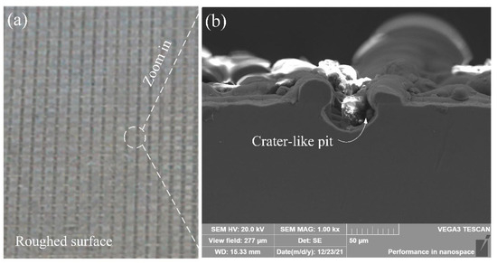 In order to promote the deposition of Al on the Ti surface, a laser marking machine was used to perform surface texturing on the Ti surface with a frequency of 50 kHz. Crater-like micro-pits were achieved, as shown in Figure 3.