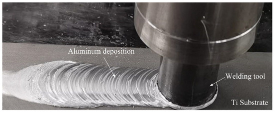 It can be seen from Figure 4 that no effective deposition was formed within the first 40 mm, but from 40 mm onwards, a stable deposition layer was gradually formed. In the initial stage, the softened material was needed to fill the gap between the tool and the Ti plate and the gaps between the tool and the Al rod. Only when the closed space among the tool, the Al rod, and the Ti plate was formed could stable deposition be achieved. If there was no shoulder, the heat would be generated only by the friction between the Al rod and the Ti plate. The plasticized material would be rolled up or overflowed in the form of a flash without circumferential constraints. The rotating shoulder with a hole of a certain internal cone angle provided space for material storage, and the plasticized material had circumferential constraints. As shown in Figure 4, there were no obvious mushroom-like flashes around the deposition tool, which preliminarily proved that the material utilization rate was nearly 100%, achieving the expected goal of the tool design.