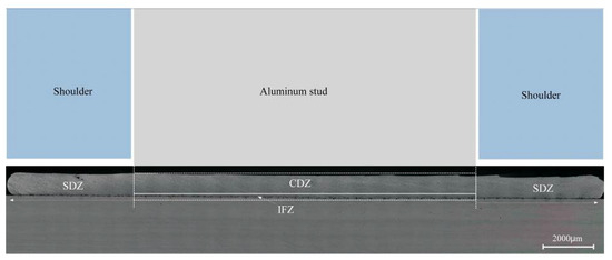 Figure 5 presents the cross-sectional morphology of the friction additive joint. According to the characteristics of the deposition process, the joint was divided into a composite deposition zone (CDZ), a shoulder deposition zone (SDZ), and an interfacial zone (IFZ). Great interfacial bonding was generated between the BM and deposition and did not separate during the subsequent deposition, suggesting a metallurgical reaction occurred between the Ti/Al interface.