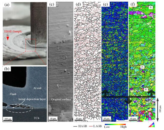 The emergency stop technique of the tool was used to investigate the instantaneous microstructure during the friction deposition process. As shown in Figure 6a, the stationary shoulder restricted the thermo-plasticized material from the flash defect to deposition. Thus, the thickness of the deposited layer was 0.8 mm, consistent with the distance between the stationary shoulder and the substrate. Figure 6c–f present the EBSD results of the CDZ. The sampling position is shown in Figure 6b. Figure 6d is the grain boundary map. Grain boundaries less than 15 were defined as low-angle grain boundaries (LAGBs) and are marked by red lines, and grain boundaries more than 15 were defined as high-angle grain boundaries (HAGBs) and are marked by black lines. It can be seen that the LAGBs were concentrated along the HAGBs. The consequent dislocation generation, pile-up, and annihilation during severe plastic deformation was the symbol of dynamic recrystallization (DRX). Figure 6f displays an IPF map of the CDZ. Around the interface (within 100 μm), the neighboring grain presented slight grain-orientation differences, while the apparent texture emerged in the interlayer and was distributed along the <101> plane. It is well accepted that the CDZ was composed of fine and random DRXed grain. However, the subsequent forging of the stationary shoulder promoted DRXed grain slipping and rotating along a specific crystal face, causing the slip direction to converge to the direction of the principal strain and ultimately leading to a convergence of the grain orientation. The high KAM values in Figure 6e were also attributed to the forging of the stationary shoulder, which could prove the above conclusion.