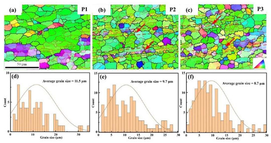 Grain size analysis at different positions of the CDZ: (a–c) P1–P3 in Figure 6f and (d–f) the corresponding grain size distribution.