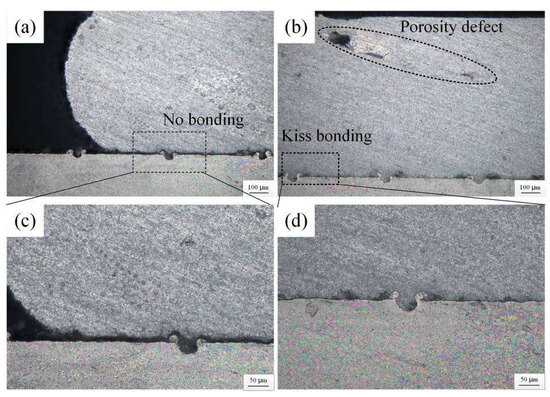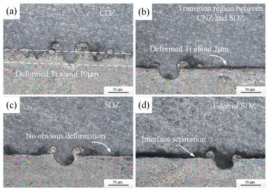 Figure 8 presents the morphology of the SDZ. The deposition was completely forged by the stationary shoulder, which recompacted the flash defect. The forging effect also promoted the metallurgical bonding at the Ti/Al interface. Thus, the SDZ morphology was similar to that of the CDZ. However, due to a lack of feedstock stirring, the SDZ presented porosity and kiss-bonding defects. As the thermo-plasticized material accumulated, it formed a semi-confined space with the stationary shoulder and the Ti substrate. The accumulated material built up in this space, producing a passive force exerted by the stationary shoulder. Such force was not sufficient to deposit the thermo-plasticized material. Thus, the SDZ possessed a non-dense microstructure.