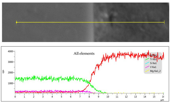 The IPZ is the interfacial bonding region formed by the combined reaction between Ti and Al. Due to the high-speed rotation and friction between the feedstock and the substrate, the substrate in the interfacial zone also underwent severe plastic deformation. Thus, the thickness of the deformed layer was more than 10 μm. The deformation of the Ti in the interfacial zone decreased, and the thickness of the IPZ was only 2 μm in the transition region between the CDZ and the SDZ and presented a discontinuous bonded interfacial layer. It was thought that the heat input away from the center of the feedstock decreased and was not favorable for the interfacial metallurgical reaction. Near the center of the SDZ, the interface showed a tightly connected state (Figure 9c). Near the edge of the SDZ, the axial pressure was released by the open space, and the interface here appeared to be separated (Figure 9d). The EDS scanning result showed a diffusion layer depth of 2 mm in the Ti/Al interface, revealing metallurgical bonding at the interface (Figure 10).