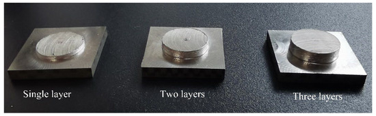 where is the diameter of the outer shoulder; is the lift height of the tool per deposition layer; is the traverse speed of the tool; S is the cross-sectional area of the Al rod; and is the materials’ feed rates.