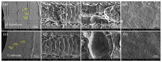 Macro/micro-morphology of the fracture surface of double-layer SRFD joint. (a) Macro-morphology fracture of the Al side; (b–d) enlarged fracture characteristics corresponding to b, c, and d in Figure 12a; (e) macro-morphology fracture of the Ti side; (f–h) enlarged fracture characteristics corresponding to f, g, and h in Figure 12e.