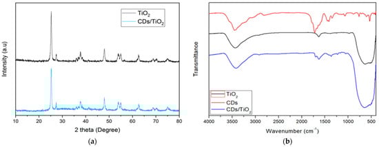 The structural properties of the synthesized materials were examined through XRD analysis. The characteristic peaks of TiO2 P25, which consists of a mixture of anatase (A) (JCPDS 21-1272) and rutile (R) (JCPDS 21-1276) nanocrystals [44], were clearly visible in both patterns, as shown in Figure 2a. More specifically, the observed diffraction peaks at 2θ: 25.24°, 27.39°, 35.90°, 36.84°, 37.72°, 38.60°, 41.10°, 48.00°, 53.91°, 55.03°, 56.66°, 62.56°, 68.87°, 70.35°, and 74.98° were assigned to the A(101), R(110), R(101), A(103), A(004), A(112), R(111), A(002), A(105), R(221), A(211), R(220), A(204), A(116), A(220), and A(215) planes, respectively [45,46]. Concerning the XRD pattern of the CD/TiO2, the absence of the characteristic signal at 13° for the CDs [47] indicated their quantum-sized dimensions, low content, and uniform, high dispersion on the TiO2 surface [48,49]. The results of the characterization of the synthesized materials using the FT-IR technique, used to clarify their chemical structure, are presented in Figure 2b. The broad characteristic band in the region above 3000 cm−1 was assigned to the water molecules absorbed on the surface and surface hydroxyl groups. FTIR spectra of the CDs and CD/TiO2 exhibited a band around 1700 cm−1 indicating the presence of C=O bonds. The broad absorption band of the CD/TiO2 nanocomposite below 1000 cm−1 became wider compared with that of the pure TiO2, which was attributed to the combination of the Ti–O–Ti and Ti–O–C vibrations. It is important to note that the XRD and FT-IR results of the CD/TiO2 presented here specifically pertain to the 3% w/w CD/TiO2 composition. The XRD and FT-IR spectra of 1, 2, as well as 4% w/w CD/TiO2 are presented in Figures S1 and S2, respectively.