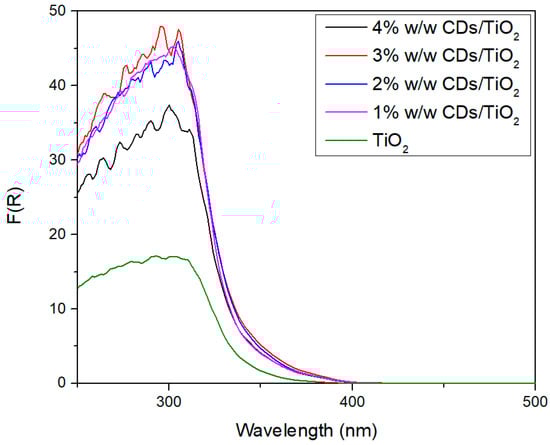 The band-gap energies of the samples were estimated from the tangent lines in the plots of the modified Kubelka–Munk function [50,51]. A remarkable change in the DR/UV-vis spectra for the containing CDs could be observed, which suggested that they reflected significantly less light than the bare TiO2-P25. This outcome showed great potential as it indicated an enhanced scattering of photons due the presence of CDs, leading to an improved light-harvesting efficiency. More specifically, the calculated band gaps of the samples with TiO2, 1% w/w CD/TiO2, 2% w/w CD/TiO2, 3% w/w CD/TiO2, and 4% w/w CD/TiO2 were 3.39, 3.26, 3.24, 3.18, and 3.13 eV, respectively.