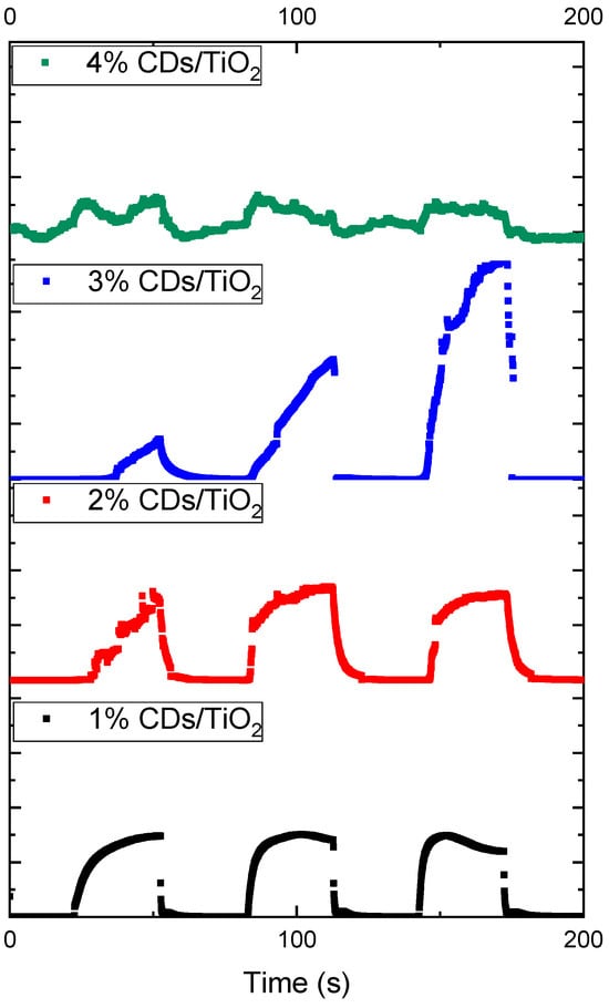 To evaluate the photoelectric response of the catalysts, the transient photocurrent responses, in order to study the photocatalytic effect, were used (I-t). Figure 5 shows the photocurrent response of the CD/TiO2 thin films of various concentrations under 1-sun illumination conditions. As expected, each of the CD/TiO2 nanocomposites produced photocurrents upon illumination, which decreased to zero when the illumination was off. Even though the presence of CDs could improve the photocurrent response of the TiO2, presumably due to enhancing charge separation and decreasing recombination, as shown in Figure 5, a stable but low photocurrent response, due to the quick recombination of photo-generated electrons and holes and the weak response of visible light, was presented for the samples with 1% w/w CD/TiO2 and 2% w/w CD/TiO2. The sample with 3% w/w CD/TiO2 demonstrated a heightened anodic photocurrent response. This could be attributed to the increased absorption of visible light and improved charge separation, both enhanced by the higher concentration of CDs. However, a further increase in CD concentration, beyond 3% w/w, did not improve the photocurrent values (4% w/w CD/TiO2); instead, the photocurrent density decreased. This observation suggested that an excessive CD content may block the active surface area. This was probably due to the opacity and light scattering of the CDs decreasing the absorption of the incident light. As a consequence, the photocurrent response was reduced [34].