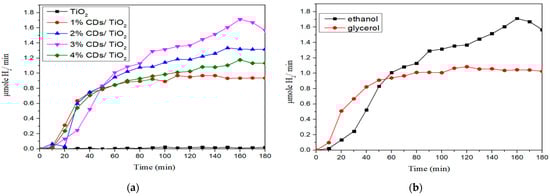 The temporal evolution of H2 in the presence of CD/TiO2 photocatalysts is shown in Figure 6. In each experiment, 200 mg of the corresponding photocatalyst was added in a 100 mL aqueous solution containing the organic substrate. In the presence of 25% v/v ethanol, the obtained data are shown in Figure 6a as a function of the CDs’ percentage and reaction time. The results revealed that there was no H2 production in the case of pure Degussa P25; however, all of the prepared nanocomposite photocatalysts exhibited satisfying hydrogen production rates. Four different loadings of CDs were tested in order to clarify which was optimal. The sample containing 3% w/w CDs demonstrated the highest H2 production rate, reaching the value of 1.7 μmol H2/min. In every curve, there was a section of the initial incline, representing the period required for hydrogen accumulation within the reaction mixture and its transport through the tubing to the detection area, and the peak rate, which served as an indicator of the maximum possible hydrogen production rate under the present conditions. The presence or absence of a plateau depended on the balance between the amount of photocatalysts and fuel, as well as the intensity of incident radiation.
