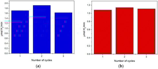 The stability and recyclability of the CD/TiO2 photocatalysts were also investigated through the cycling experiments that are exhibited in Figure 7. More specifically, a 3% w/w CD/TiO2 photocatalyst was used for three consecutive cycles in the presence of each sacrificial agent (ethanol and glycerol). Each cycle was carried out under the exact same conditions mentioned in Section 2.5. After each test, the photocatalyst was thoroughly washed with DI water. The recyclability study revealed that the photocatalyst exhibited consistent stability during its reuse for hydrogen production from both ethanol and glycerol. However, in both cases, there was an increment in the second cycle. This may have been due to the formation of intermediates during the process, which possibly enhanced the nanocomposite’s photocatalytic activity [52]. It is worth mentioning that the XRD spectra of the CD/TiO2 nanocomposites after the utilization of three consecutive cycles are presented in Figure S3. Based on the XRD results, there were no alterations in the crystal structure of the sample, proving the photocatalyst’s high stability.