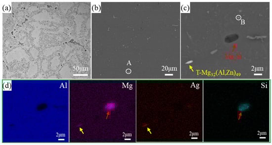 - In regard to the as-cast alloy, the microstructure contained a large number of dendrites with significant diameter segregation. The second phase consisted of the T-Mg32(Al, Ag)49 phase and the Al6(Mn, Fe) phase.