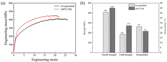 - The mechanical properties of the alloy in the peak-aged period improved greatly as compared to that of the as-quenched alloy. The tensile strength grew from 410 MPa to 449 MPa while the yield strength increased from 185 MPa to 273 MPa, an increase of 9.5% and 47.5%, respectively.