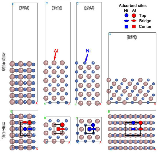 In order to clarify the effects of the removal reagent components on the uniform stripping of the AlSiY coating, the electronic work functions (EWFs) of the stripped surfaces were calculated in the framework of first-principles calculation. According to the phase composition measured by XRD, the β-NiAl phase dominated in the AlSiY coating and there were four main crystal orientations on the stripped surfaces, i.e., (110), (100), (200) and (211). Thus, the chemical reactions between the removal reagents and stripped surfaces were systematically investigated on these four surfaces. In the present work, three removal reagent components were considered, i.e., nitric acid (HNO3), hydrofluoric acid (HF) and chromium trioxide (CrO3). Corresponding to the experiment, four different combinations of acid ions were imported onto the stripped surfaces. They were HNO3-only, a CrO3+HNO3 mixture, a HF+HNO3 mixture and a HF+CrO3+HNO3 mixture. Additionally, different amounts of HNO3 in the acid mixtures were considered. For the HNO3-only reagent, a surface slab model containing 1 to 3 nitrate ions (NO3−) was built. For the mixture reagents, one fluorinion (F−) or/and a chromium trioxide molecule was added to the surface slab model. Then, the surface slab models were optimized and the EWFs and electronic structures of the stripped surfaces could be obtained. Considering the complex structure of liquid removal reagents, the adsorption sites of acid ions on the surfaces are usually randomly distributed. Thus, in the present work, the acid ions were also randomly added on the specific adsorption sites of the calculated surface. At least four different configurations for each condition were calculated and the average EWF was applied to evaluate the stripping tendency of the stripped surfaces. The calculated surface slab models and the adsorption sites are schematically shown in Figure 1.
