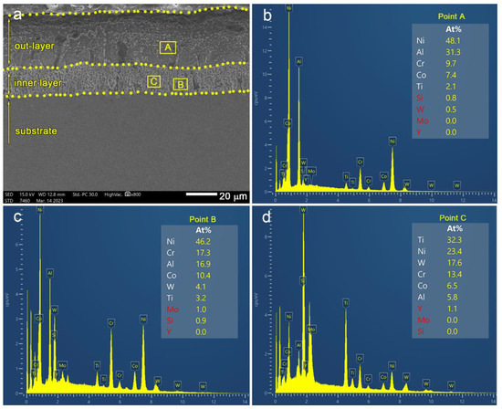 SEM image of cross-sectional morphology of the AlSiY coating deposited on K465 superalloy and the elemental distribution in the deposited AlSiY coating. (a) SEM image of cross-sectional AlSiY coating; EDS spectra of (b) point A, (c) point B and (d) point C in (a).