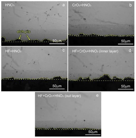 Cross-sectional morphologies of the AlSiY coatings after chemical stripping using (a) HNO3-only, (b) CrO3+HNO3 mixed and (c) HF+HNO3 mixed removal reagents. (d,e) show the coarse inner layer and smooth outer layer after chemical stripping using the HF+CrO3+HNO3 mixed removal reagent, respectively. The dashed lines represent the profiles of smooth surfaces and the dotted lines represent the profiles of etched surfaces. The area enclosed by the dashed lines and dotted lines and its shapes show the homogeneity of chemical stripping.