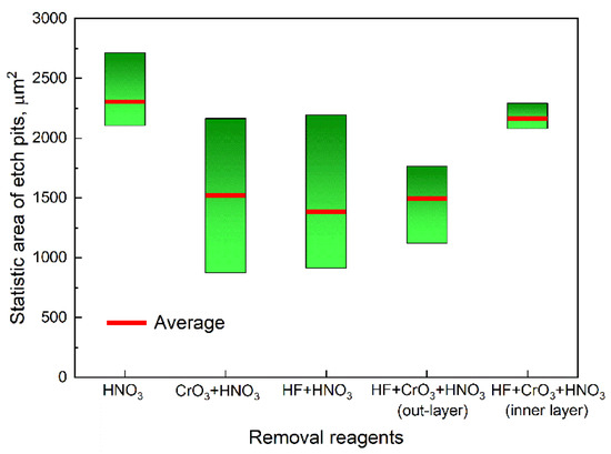 The statistical area of etch pits for different removal reagents. A low average value indicates the good homogeneity of chemical stripping in the microscopic scale, and a narrow statistical distribution indicates good homogeneity in the macroscopic scale.