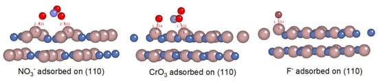 Referring to the previous results, we found that the homogeneity of chemical stripping was improved when the HF and/or CrO3 was added to the HNO3 removal reagent. The calculated results of the EWFs explain this phenomenon via the change in the corrosion cathode from the (110) surface to the (200) surface. In fact, the EWFs on the stripped surfaces are significantly dependent on the bond characteristics. The number of electrons involved in bonding on the stripped surfaces is proportional to the corrosion tendency of the surfaces. Figure 9 shows the integrated density of states of the adsorbed O atoms on the (110) and (200) surfaces. Here, we only consider the O atoms in the NO3− to clarify the effects of the HF and/or CrO3 addition. For the (110) surface, the integrated DOS of adsorbed O atoms around the Fermi level increases with HF and/or CrO3 addition, which indicates the enhanced corrosion rate on the (110) surface and the decreased EWF. Meanwhile, for the (200) surface, the opposite variation appears. The mixed removal reagent with HF and CrO3 addition has the highest integrated DOS on the (110) surfaces, as well as the lowest integrated DOS on the (200) surfaces, which ensures the cathode transformation between the (110) and (200) surfaces. The reduced area of the cathode is beneficial for the homogeneity of chemical stripping.
